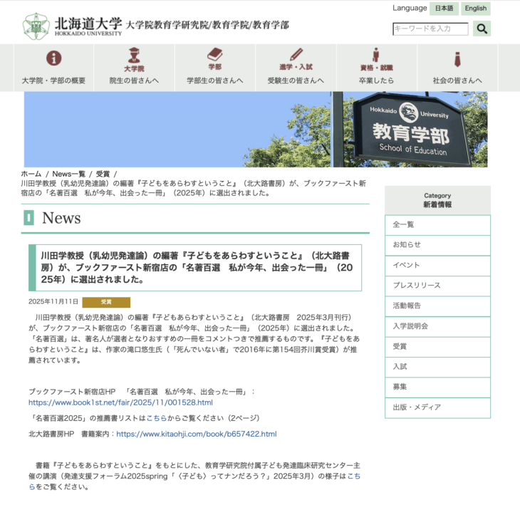 当センター長・川田学教授の編著「子どもをあらわすということ」がブックファースト新宿店「名著百選 私が今年、出会った一冊」(2025年)に選出されました。